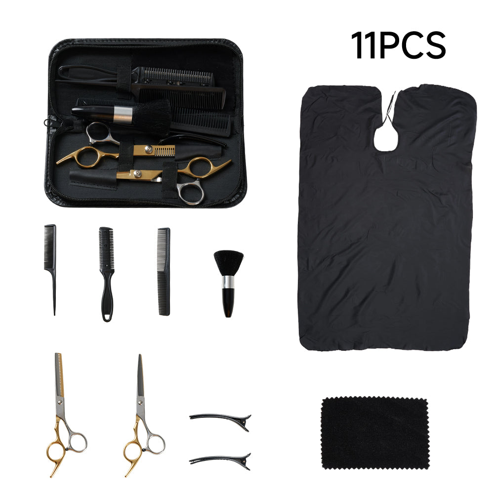 This 11-piece hair-cutting scissors set combines practicality and style. It includes two professional stainless steel scissors for cutting, thinning, and styling, plus three combs for precise sectioning and trimming. Also features a barber cape, a mini hair sweep brush, and a cleaning cloth to clean hair clippings and maintain your tools. The sleek silver-and-gold dual-tone finish of the scissors adds a premium, professional look. With all 11 essential pieces, it is ideal for both home use and professional grooming—making every haircut efficient and refined.