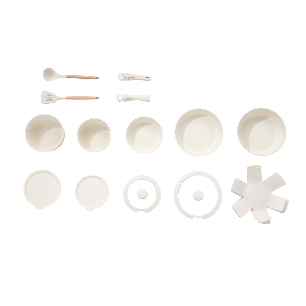 Enhance your cooking experience with this versatile cookware set! Designed to meet a variety of cooking needs, this set includes skillets, a saucepan, and essential utensils. Crafted from die-cast aluminium with a stainless steel reinforced base, each piece offers quick, even heat distribution. Double-layer, water-based non-stick coating ensures food is released easily while remaining free from harmful substances. A standout feature is the inclusion of two detachable handles that fit all pans, offering multipurpose use and saving valuable storage space. Whether you are cooking or serving, this set performs reliably.