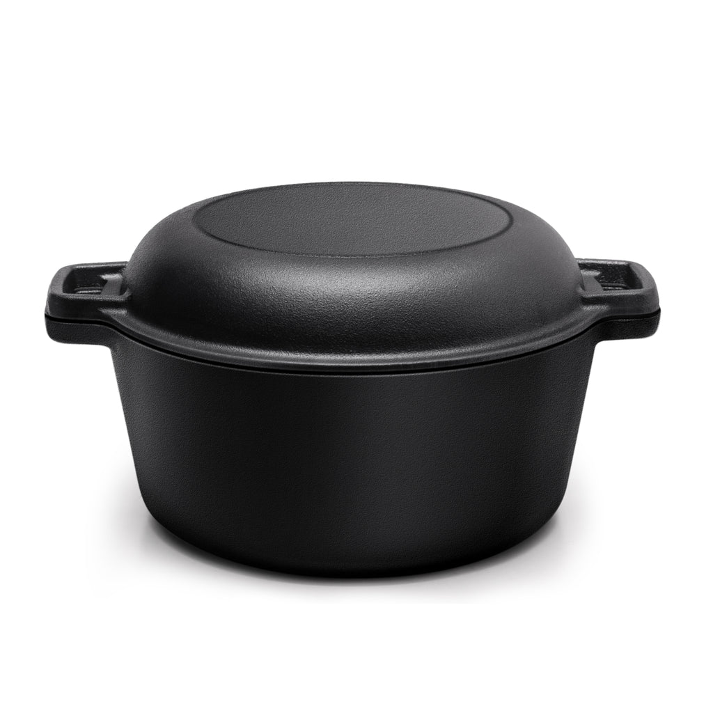 The only pot you will ever need. Crafted from chemical-free cast iron, this 2-in-1 Dutch oven unlocks endless meal possibilities. Thick walls provide even heat distribution and excellent heat retention, ideal for slow-cooked stews, artisan bread, and seared meats. The spacious cooking base supports frying, roasting, braising, and baking. Although it lacks a traditional non-stick coating, regular use builds up a natural seasoning that becomes naturally non-stick over time. A domed, close-fitting lid improves steam circulation, locks in moisture, and enhances flavour, delivering consistently rich results with every dish.