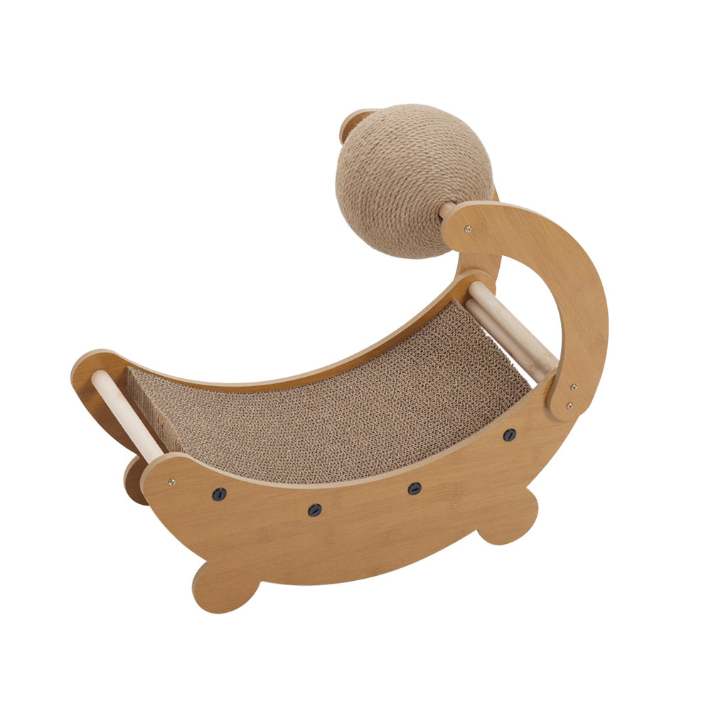 Our 2-in-1 cat scratching board perfectly combines the needs of your cats for scratching and resting. With its high-appearance original wood-colour shell and moon boat design, complemented by a sisal ball at the top, it captures the attention of cats. Made from high-quality material, it provides an ideal space for scratching and exercising, contributing to the muscle health of your cats. The specially designed curved structure fits the neck of cats, offering them the most comfortable support, allowing cats to fully relax. Additionally, the bottom is equipped with multiple support legs and screws for fixation, ensuring it will not easily tip over even during intense play sessions.