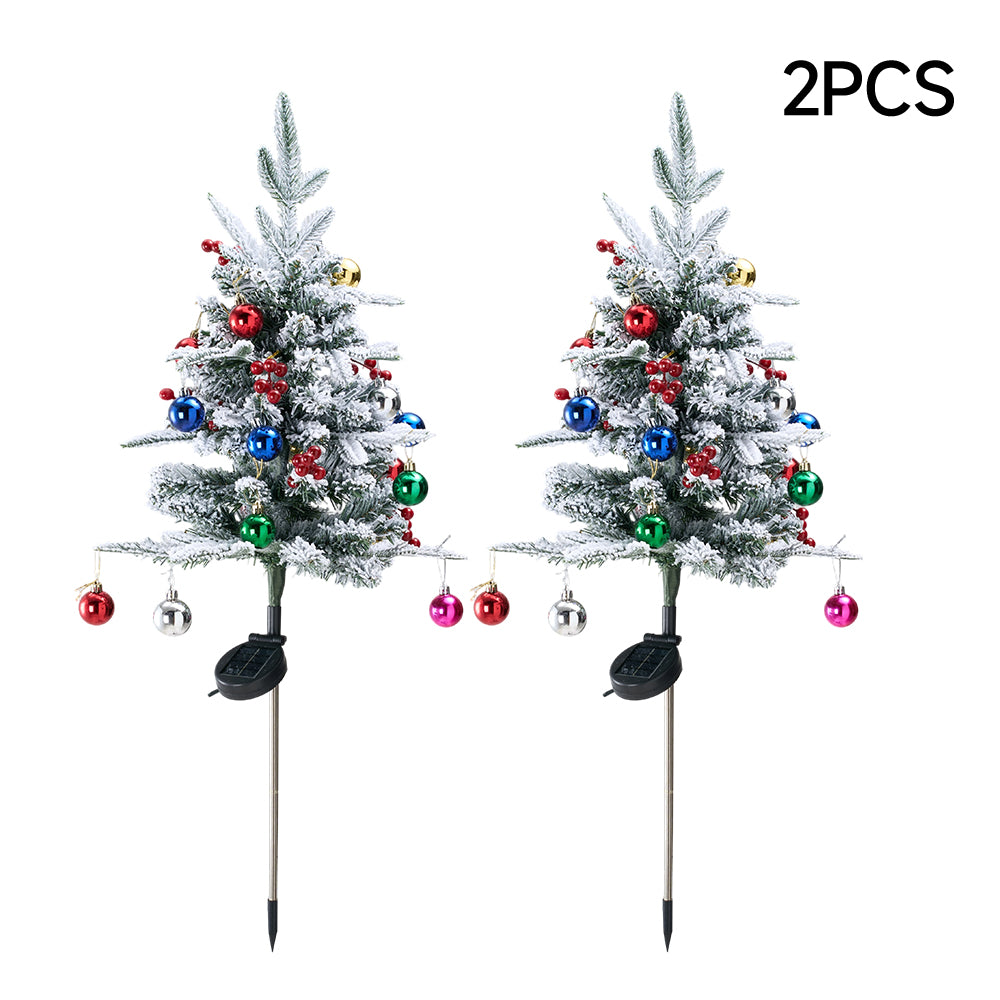 Transform your outdoor holiday decor with this 2-pack of solar-powered Christmas trees, featuring snow-dusted branches and colourful ornaments that light up at night. Adorned with vibrant baubles and red berry sprigs, they create a festive and cheerful holiday scene. Powered by solar energy, they automatically illuminate at dusk, casting a warm glow over your garden, patio, or entryway. Compact and weather-resistant, these trees are perfect for spreading holiday cheer across your porch, front door, or yard all season long.
