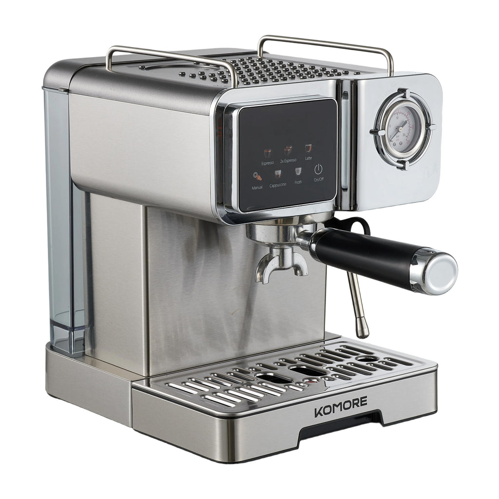 Brew barista-quality espresso at home with this intuitive machine. Its brushed finish adds a premium look that complements any kitchen décor. A 1350W heating system and 20-bar pump deliver rapid, high-pressure extraction for rich, aromatic coffee. A large 1.6-litre clear tank lets you monitor water levels easily, and the responsive touch panel offers single/double shot modes plus manual control over brew time and volume. The adjustable steam wand creates velvety microfoam for lattes and cappuccinos, while the top cup-warming area keeps drinks at the perfect temperature—turning every morning into a café-style experience.