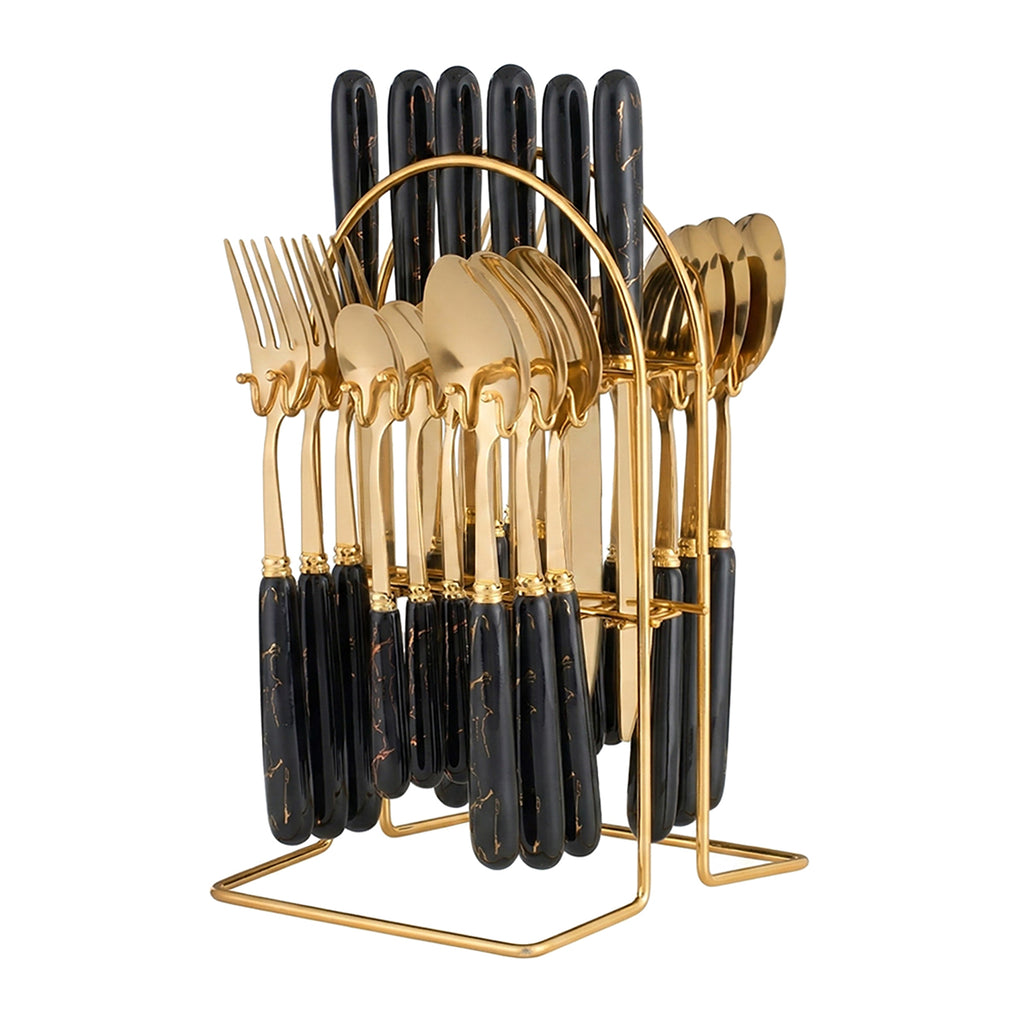 Elevate your dining experience with a refined cutlery set. This 24-piece black-and-gold set features knives, forks, large spoons, and teaspoons—perfect for six people and ideal for daily meals or elegant dinner parties. The handles are crafted from smooth, high-quality ceramic for a comfortable, slip-resistant grip, while the stainless steel utensils are non-toxic, corrosion-resistant, and built to last. Whether for family gatherings, holiday feasts, romantic dinners, or upscale restaurants, this set adds sophistication and style to any table setting.