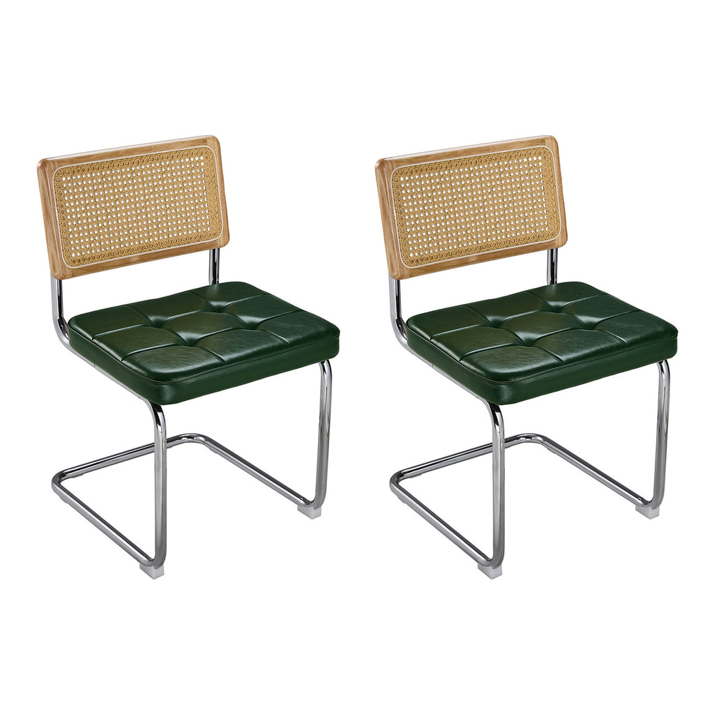 This dining chair set elegantly blends natural and retro styles, adding a unique charm to your dining space. The backrest combines premium rattan with a wooden frame, ensuring durability while exuding vintage appeal. The breathable woven rattan design promotes air circulation, keeping you cool and comfortable. The seat features smooth PU leather upholstery with high-density foam padding, offering soft yet resilient support for all-day comfort. The chairs are equipped with stable metal legs at the bottom, which are slip-resistant and wear-resistant, offering reliable support for the seats. Whether paired with a dining table or used as a casual single chair, they can inject a warm and natural atmosphere into your home environment.