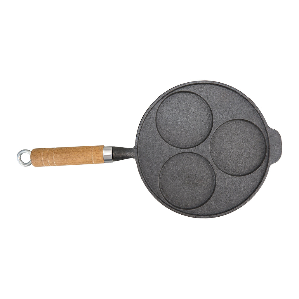 Start your day with delicious variety and energy! This cast iron frying pan features three separate cooking zones—perfect for frying bacon, eggs, or sausages simultaneously without flavour mixing, doubling your efficiency. The thickened base ensures fast, even heat distribution to lock in flavour and enhance cooking results. An anti-slip wood handle offers a comfortable, heat-resistant grip for safe handling. Compatible with gas stoves, induction cookers or outdoor open flames, it is ideal for both home cooking and camping.