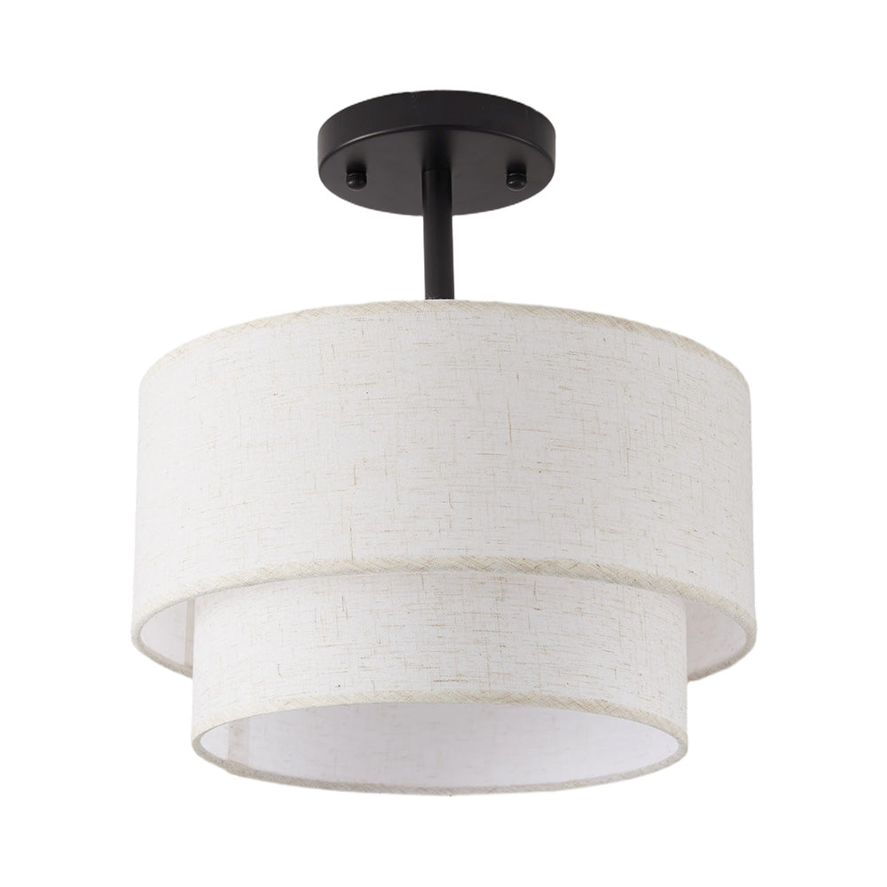 This ceiling light embodies modern design with refined simplicity. It features a double-layer cylindrical fabric shade arranged in an offset layout, creating rich depth and striking visual dimension. The matte black metal canopy and support rod contrast elegantly with the light-toned fabric, blending contemporary and industrial aesthetics. With a finely textured surface, the shade diffuses light softly and evenly—eliminating glare and casting a warm, comfortable glow. Compact and versatile, it seamlessly fits bedrooms, hallways, kitchens, or small living rooms, adding understated sophistication to any space.