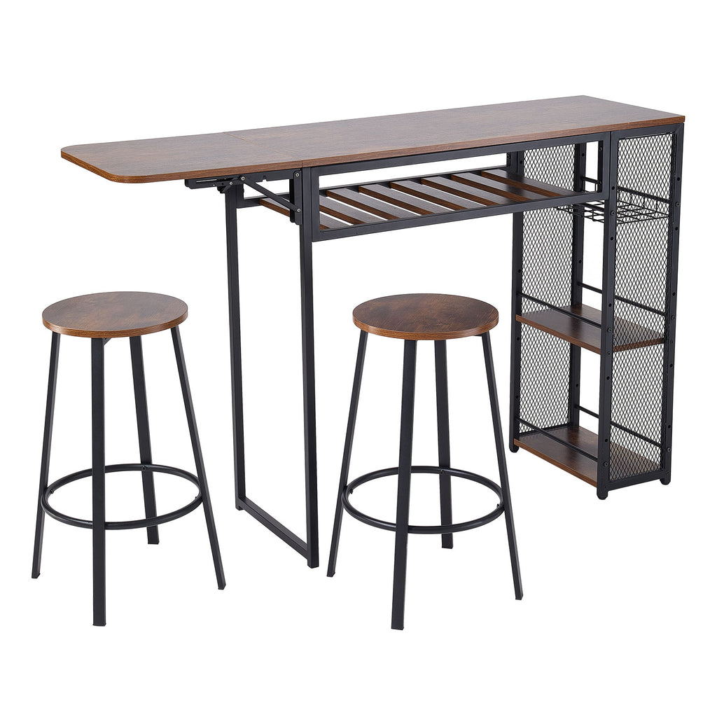 This compact 3-piece bar table set, including one table and two stools, is designed for modern living. The set pairs a vintage-style finish with a black metal frame, bringing industrial charm to kitchens, dining areas, home offices, or casual nooks—perfect for relaxed chats with friends. Each stool features a circular footring for comfortable leg support during extended sitting. Its space-saving design lets both stools tuck neatly under the table when not in use, ideal for smaller homes or rentals. More than just a bar set, it also works as a dining table or compact workspace. A stylish, versatile choice that balances form and function.