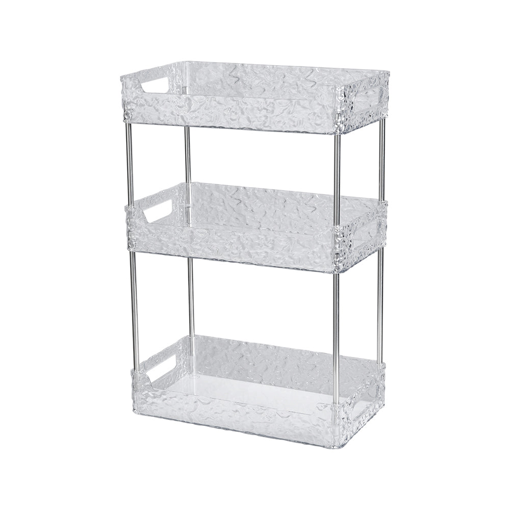 Elevate your bathroom with this stunningly simple yet elegant storage organiser. Crafted from crystal-clear, high-quality PET material with a delicate textured finish, it adds a touch of sophistication to any space. The sturdy stainless steel support ensures stability and prevents tipping, keeping your essentials safe and secure. With its three-tier open design, you can neatly arrange toiletries, cosmetics, and towels for instant organisation. This is not just practical storage – it is a beautiful upgrade that transforms your bathroom into a tidy and luxurious haven.