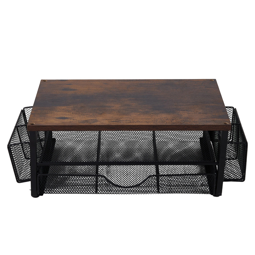 Organise your workspace efficiently with this printer stand, a perfect blend of style and functionality. Crafted from a combination of metal and wood, this stand embodies modern simplicity. Its three-tier structure optimises space, allowing for a tidier and more productive desk style. The top features a rustic wood grain effect finish, offering a warm and natural aesthetic that enhances any office décor. Below, the two layers boast a sleek black metal mesh design, ensuring visibility and accessibility. Two pen holders on either side feature internal compartments to keep writing instruments neatly arranged, promoting an orderly work surface. Ideal for home offices or compact workspaces, this printer stand excels in both elegance and practicality.
