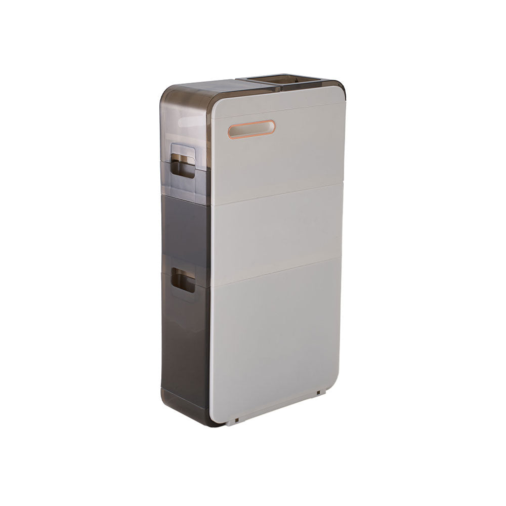 Smartly designed for vertical efficiency, this elegant bathroom storage cabinet blends practicality with style. The top groove securely holds toothbrushes, mugs, and other essentials, while a hidden compartment beneath neatly stores small items like hairpins or cotton buds. Lift the dust-resistant lid to access the spacious main section, and enjoy smooth, fuss-free tissue dispensing through the side slot. Below, two drawers offer ample, dust- and moisture-protected storage with easy-grip handles for effortless use. Perfect for compact bathrooms or utility spaces, it brings calm, organised simplicity to everyday living.
