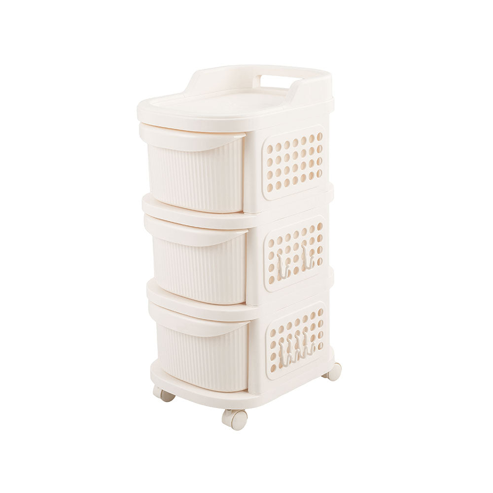 Organise your home with this compact and sturdy storage trolley. Featuring 3 convenient drawer-style compartments, it is perfect for neatly storing clothes, toys, books, and everyday essentials, maximising your space. The spacious, flat top platform provides easy access to frequently used items. A side net rack with hooks offers additional storage for small items like keys and headphones, optimising organisation. Equipped with lockable caster wheels, it moves effortlessly between rooms and stays securely in place when needed. Its simple design and soft colour palette blend seamlessly into any home, making it an ideal storage solution for bedrooms, living rooms, nurseries, or bathrooms.