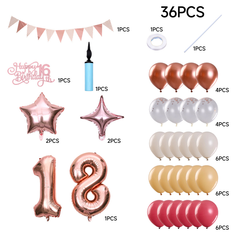 Easily create a delightful and unforgettable birthday party! This 36-piece birthday decoration set includes a variety of balloon shapes, sizes, and accessories—perfect for crafting a romantic celebration. Featuring a soft pink base with complementary rose gold, silver, ivory, and champagne tones, it creates a dreamy, feminine ambiance. With plenty of colourful balloons for creative arrangements and standout pieces like star-shaped and large “18” balloons, your space will be festive and eye-catching. Ideal for both indoor and outdoor events—from family gatherings to garden parties—it brings joy and lasting memories to any 18th birthday celebration.