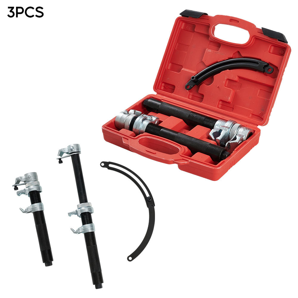 This 3-piece coil spring compressor kit includes two heavy-duty compressors and an auxiliary support arm for safe, stable operation under high pressure. Precision-adjusted screw mechanisms and adjustable chucks accurately fit various spring diameters, ensuring even compression and preventing damage or ejection. The dual-end clamping design provides a secure grip, boosting efficiency and safety. The included support arm aids in stabilising the shock absorber top, crucial for tight spaces. An essential professional tool for routine maintenance or shock replacement, tackling complex suspension tasks with ease.