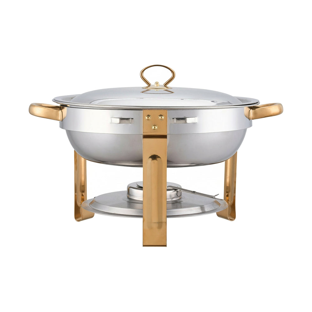 Let every gathering shine with a sense of sophistication. Crafted with a polished mirror finish and gold-tone accents, this chafing dish is sure to capture attention at any buffet or party. Boasting a 4.5-litre capacity, it comfortably holds a variety of dishes, from meats to vegetables and seafood. An alcohol burner at the base ensures your food stays warm throughout the event. A fitted lid locks in heat and freshness, and convenient handles make moving the dish effortless. Ideal for home parties, weddings, hotel breakfast buffets, and corporate events, it turns any dining table into a stylish focal point.
