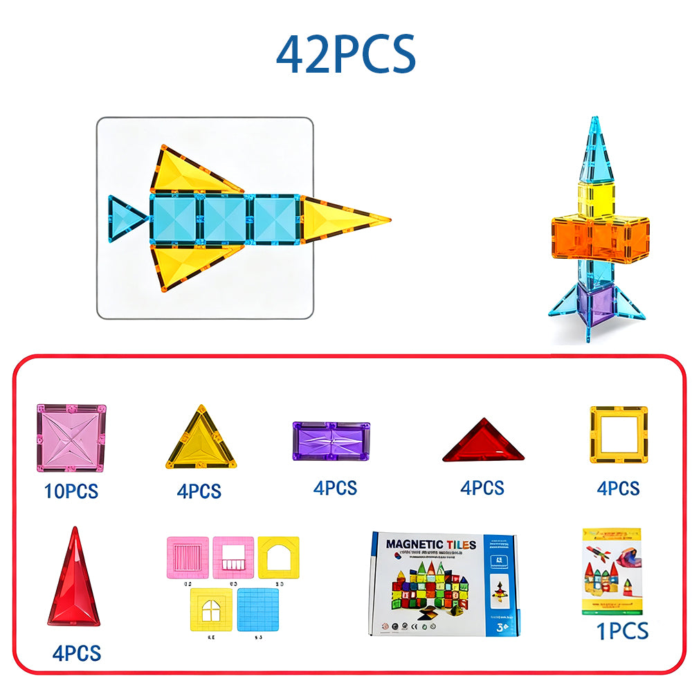 This 42-piece magnetic tile set blends artistic elegance with early childhood learning. Featuring vibrant colours and various geometric shapes, the tiles spark curiosity in colour and shape recognition while encouraging playful, hands-on exploration. Their slim, lightweight design fits comfortably in little hands for easy gripping and effortless building. As children create 3D structures and imaginative scenes, they naturally develop foundational spatial awareness and thinking—turning open-ended play into a joyful journey of creativity and cognitive growth.