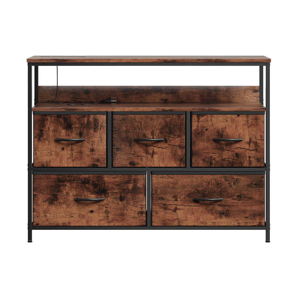 Transform your living space with this stylish and practical storage cabinet. The sleek frame adds a bold industrial touch while providing reliable support. With five fabric drawers, it offers ample storage for everyday essentials, keeping your items neatly organised. The two-tier open shelves on top are perfect for displaying books, décor, plants, or small electronic devices. The lower shelf features a raised back edge to prevent items from slipping off, enhancing both safety and functionality. What sets it apart is the embedded power strip with two standard sockets, one USB port, and one C-type port, making it ideal for charging your devices. Its compact design fits perfectly in bedrooms, living rooms, or hallways, while doubling as a stylish focal point in your home.