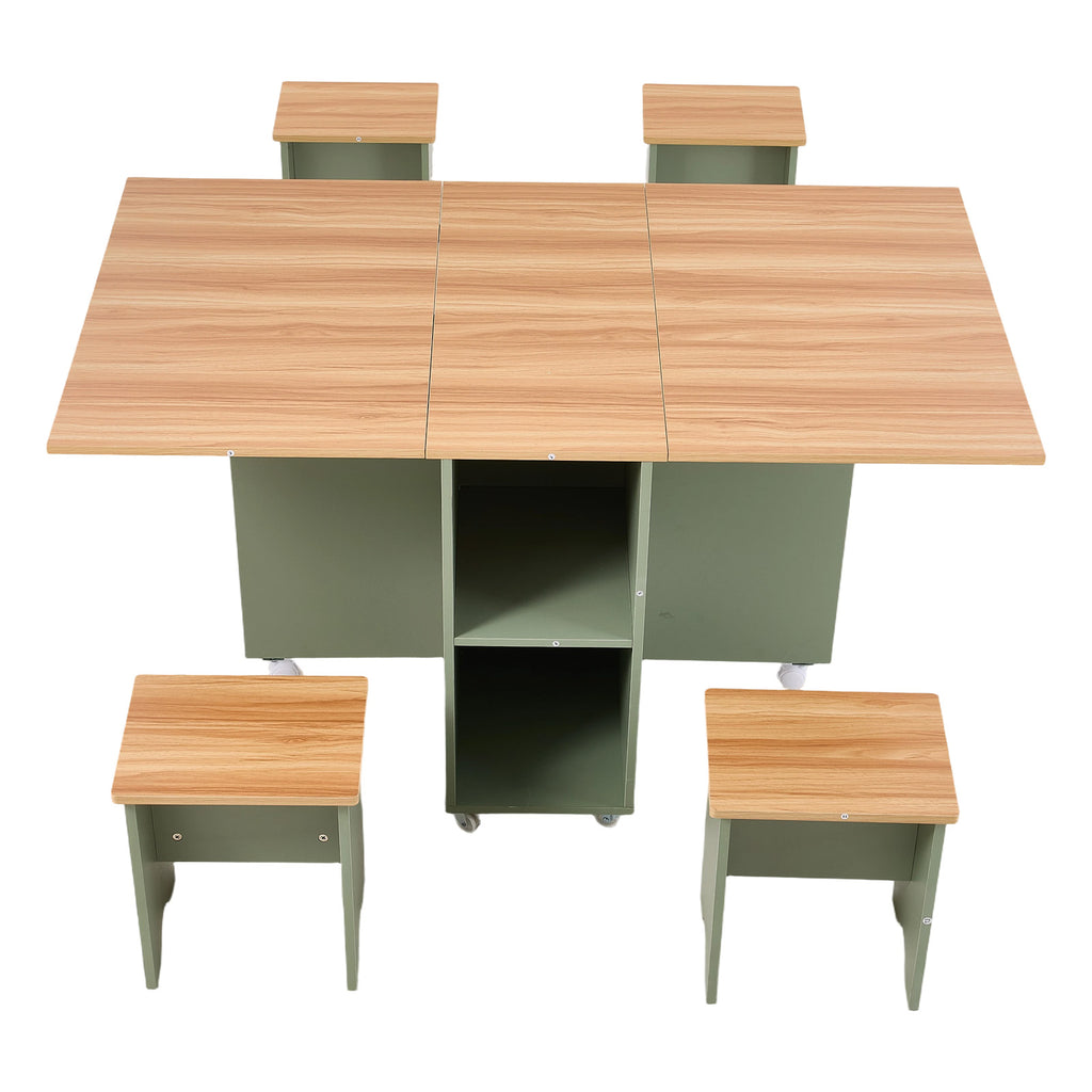 This table and chair set cleverly combines storage and dining functions into one. Featuring a minimalist design with a green body and light wood grain, it effortlessly blends into various home decor styles. The drop-leaf tabletop can be easily expanded for large gatherings or folded away to save space when not in use. Side-mounted open storage shelves allow you to keep daily essentials within reach and neatly tuck away the four matching stools, maximising functionality. Whether used as a family dining table, a study desk, or an outdoor activity table, this set is a practical addition to any home.