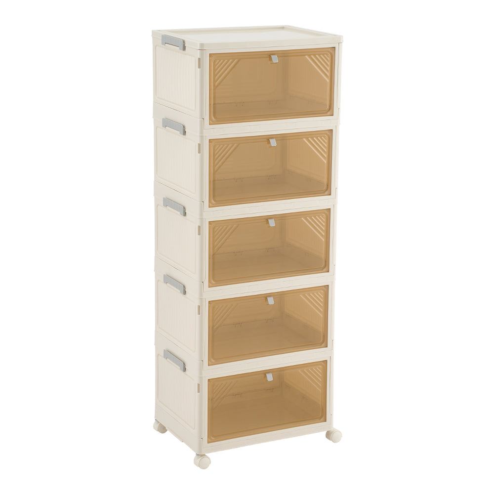Bring order to your hallway with this shoe cabinet. It offers five compartments for sorting footwear by season, style, or occasion, while flip-down lids keep dust and moisture out. Side snaps securely lock stacked units together, and the flat top provides room for keys, handbags, or daily essentials. Four smooth-rolling castors let you glide it into position with ease and keep it steady when needed. This shoe cabinet is practical, tidy, and designed for modern living.
