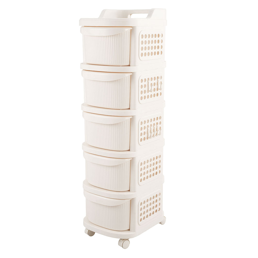 Organise your home with this compact and sturdy storage trolley. Featuring 5 convenient drawer-style compartments, it is perfect for neatly storing clothes, toys, books, and everyday essentials, maximising your space. The spacious, flat top platform provides easy access to frequently used items. A side net rack with hooks offers additional storage for small items like keys and headphones, optimising organisation. Equipped with lockable caster wheels, it moves effortlessly between rooms and stays securely in place when needed. Its simple design and soft colour palette blend seamlessly into any home, making it an ideal storage solution for bedrooms, living rooms, nurseries, or bathrooms.