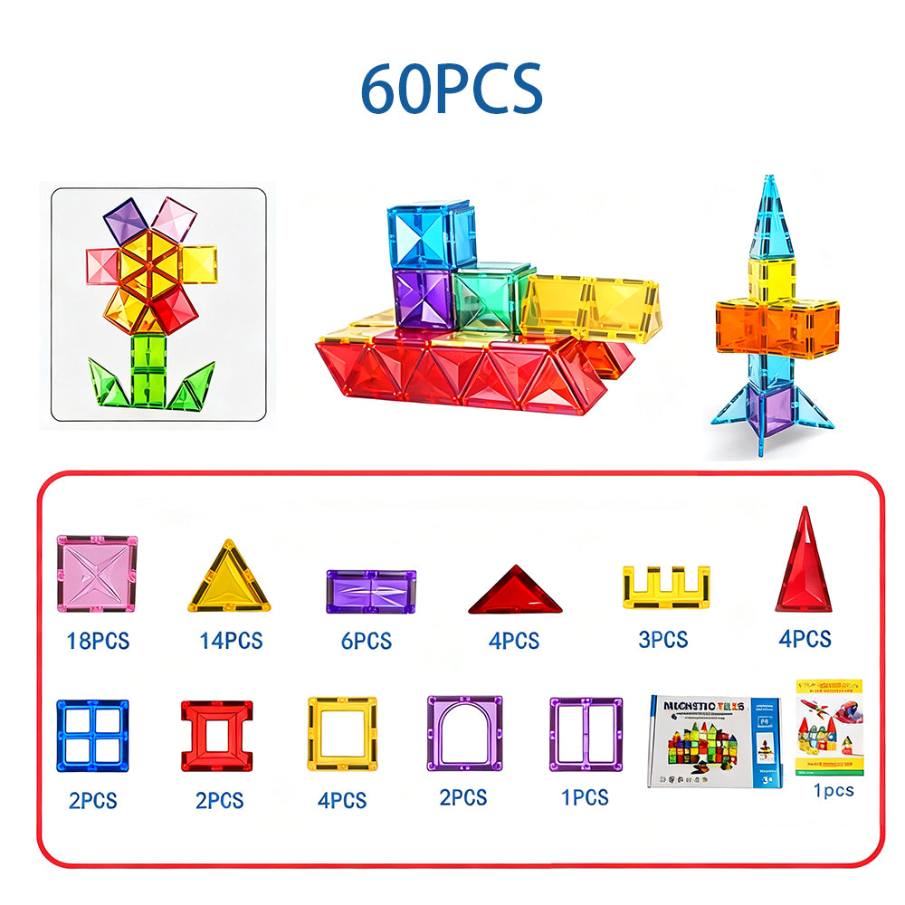 This 60-piece magnetic tile set blends artistic elegance with early childhood learning. Featuring vibrant colours and various geometric shapes, the tiles spark curiosity in colour and shape recognition while encouraging playful, hands-on exploration. Their slim, lightweight design fits comfortably in little hands for easy gripping and effortless building. As children create 3D structures and imaginative scenes, they naturally develop foundational spatial awareness and thinking—turning open-ended play into a joyful journey of creativity and cognitive growth.