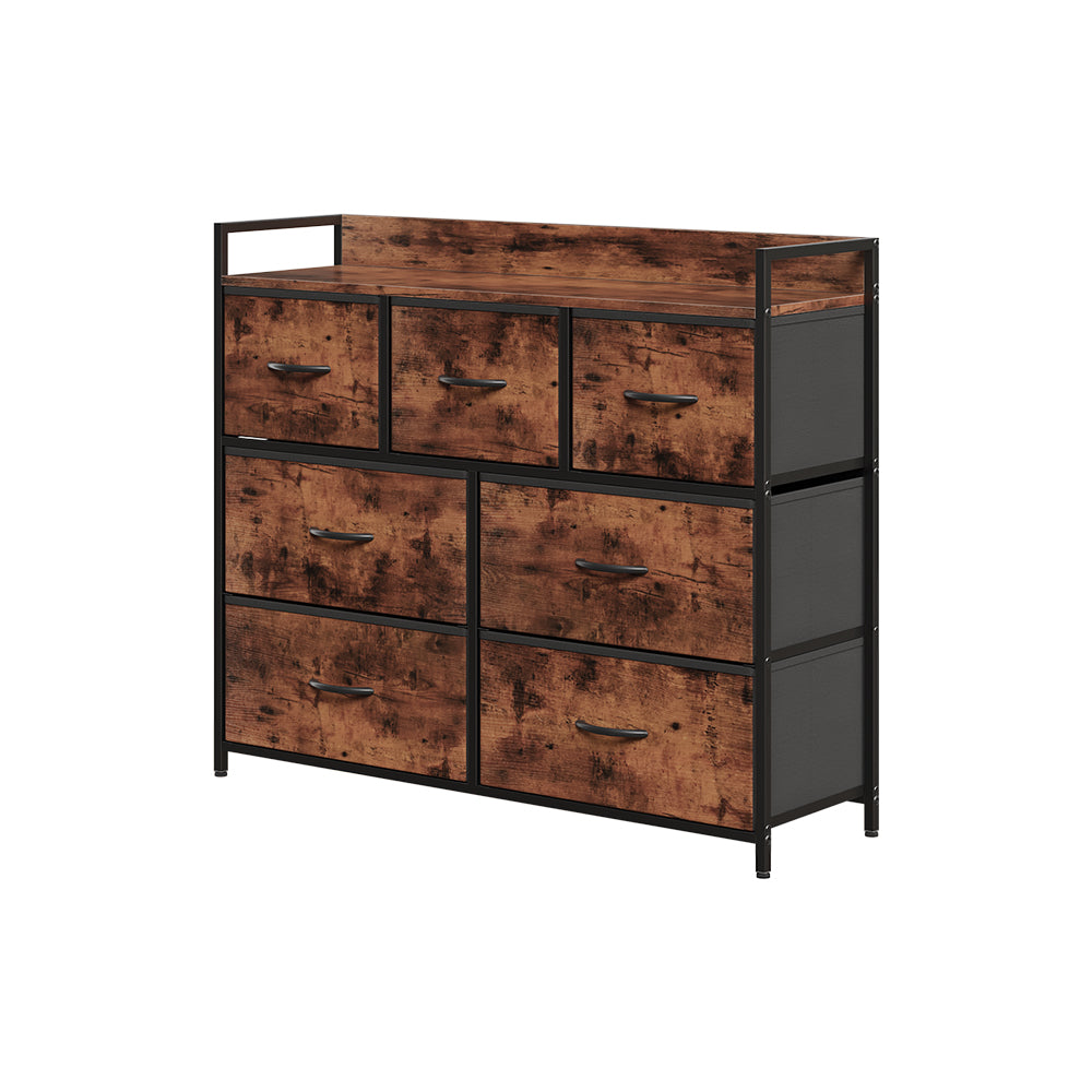 Elevate your living space with this sleek and functional storage cabinet. Clean lines define its form, creating a bold industrial aesthetic, and it boasts a retro colourway for a considered, contemporary look. Seven fabric drawers provide the perfect balance of practicality and aesthetics, offering a neat and organised solution for daily items. The top shelf, complete with a rear border, forms a safe display area for decorative pieces, picture frames, or small plants, enhancing both the functionality and charm of the cabinet. A compact yet layered design makes it a versatile addition to any bedroom, living room, or hallway, doubling as both storage and a style focal point.