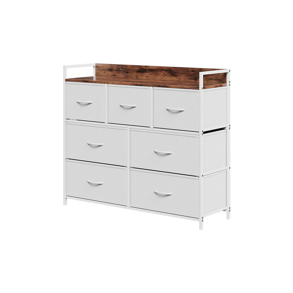 Elevate your living space with this sleek and functional storage cabinet. Clean lines define its form, creating a bold industrial aesthetic, and it boasts a retro colourway for a considered, contemporary look. Seven fabric drawers provide the perfect balance of practicality and aesthetics, offering a neat and organised solution for daily items. The top shelf, complete with a rear border, forms a safe display area for decorative pieces, picture frames, or small plants, enhancing both the functionality and charm of the cabinet. A compact yet layered design makes it a versatile addition to any bedroom, living room, or hallway, doubling as both storage and a style focal point.