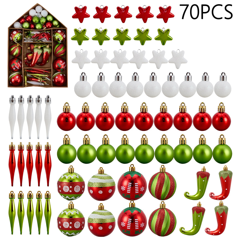 These 70-piece Christmas ornaments bring festive charm and warmth to any space. With ample ornaments for large trees or multiple smaller displays, they meet a wide range of decorating needs. Each piece showcases classic festive colours accented with shimmering details, blending tradition with sparkle for a joyful holiday look. Designed with hanging holes and hanging cords, they are ready to use straight out of the box. Perfect for trees, doors, windows, walls, or party décor, they spread Christmas cheer throughout your home.