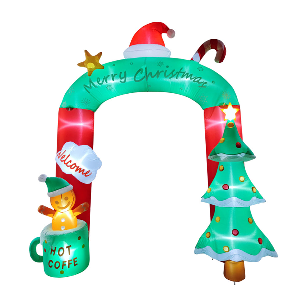 Create an unforgettable holiday welcome with this charming Christmas inflatable! Featuring a Merry Christmas arch, this festive display includes playful gingerbread men, a Christmas tree, candy canes, and a hot coffee cup, all radiating a sense of joy and nostalgia. Built-in LED lights cast a warm glow when lit, adding a cosy touch to your winter décor. Made with 210T polyester, it is waterproof and durable, perfect for both indoor and outdoor use. Instantly brighten your home, garden, or business with festive charm.