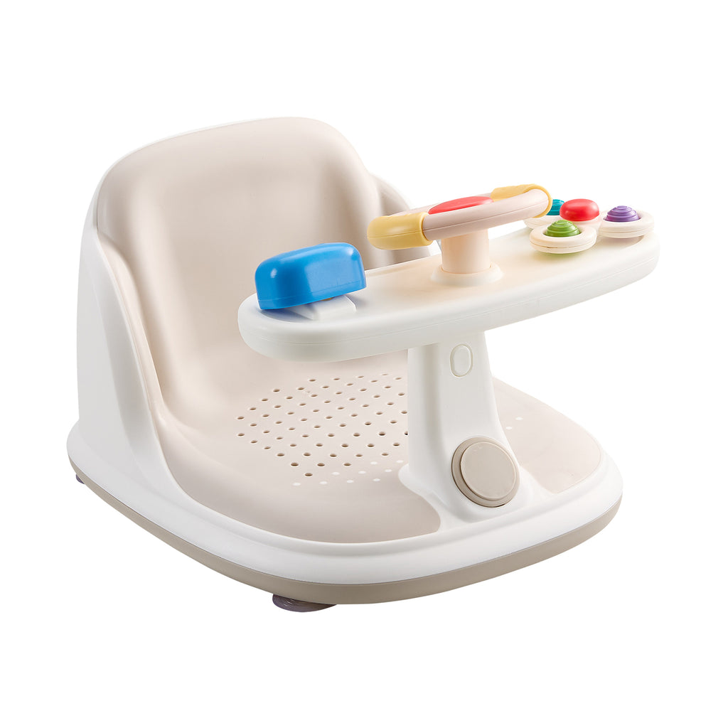Make bath time both safe and entertaining with this baby bath seat, designed to offer comfort and confidence during every wash. Its soft TPE seating and backrest provide a gentle and supportive surface for your baby. The widened design offers ample room, while the perforated base allows quick drainage to help prevent slipping. A raised backrest promotes proper sitting posture and relaxation, and the semi-wrap structure enhances a sense of security. Upfront, a playful activity panel delights your little one and turns routine baths into engaging moments. Fully rounded edges and finish ensure complete peace of mind for parents.