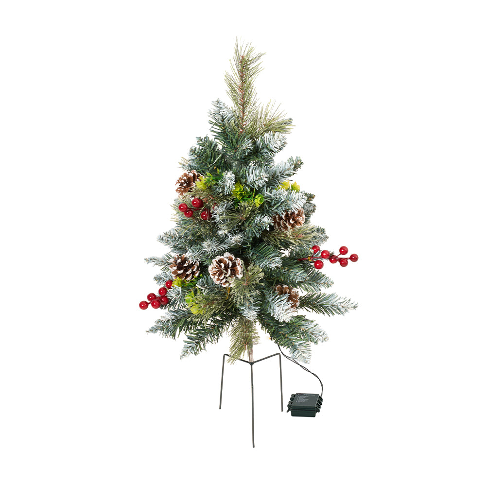Complete your outdoor festive décor with this Christmas tree, designed with a sturdy metal tripod stake for easy insertion into soil, planters, or floral foam. Adorned with pinecones and red berries, it showcases lush, realistic pine-like foliage for instant holiday charm. Compact and weather-resistant, it is perfect for gardens, porch planters, or entryway displays, and ideal for bringing a touch of festive cheer to your outdoor spaces.