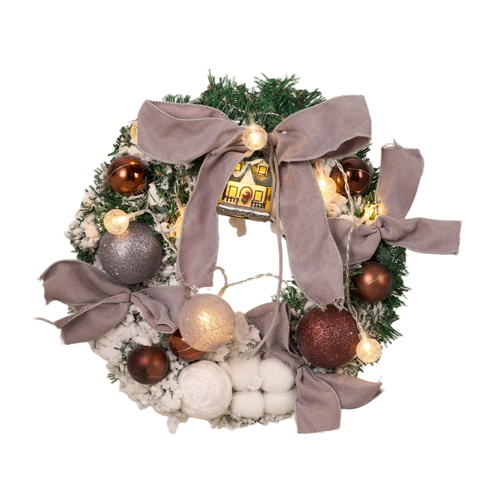 Adorn your home with a touch of enchanted winter woodland charm. Crafted with a realistic pine needle design, the wreath is surrounded by delicate white accents that create a serene winter wonderland atmosphere. Nestled at the top centre rests a miniature cabin, its exquisite and compact design conveying the warmth of home and the joy of the festival. Decorative balls and matching bows enhance the depth of the wreath, adding an extra layer of charm. With its soft, glowing lights weaving through the arrangement, the wreath brings a dreamlike glow to your home, infusing your space with festive warmth and beauty.