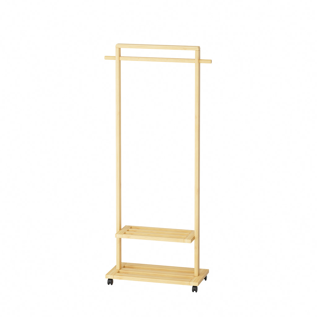 This clothing rack helps keep your entryway tidy while adding a stylish and modern touch to your home. Its minimalist design creates a warm, natural aesthetic that blends seamlessly with any decor. The top hanging bar offers ample space for coats, jackets, and umbrellas, ensuring quick and easy access. Additionally, the double-tiered shelf at the bottom provides extra storage for bags, shoes, or hats. With its space-saving design, this compact clothing rack is perfect for apartments and small spaces, combining functionality with sleek aesthetics.