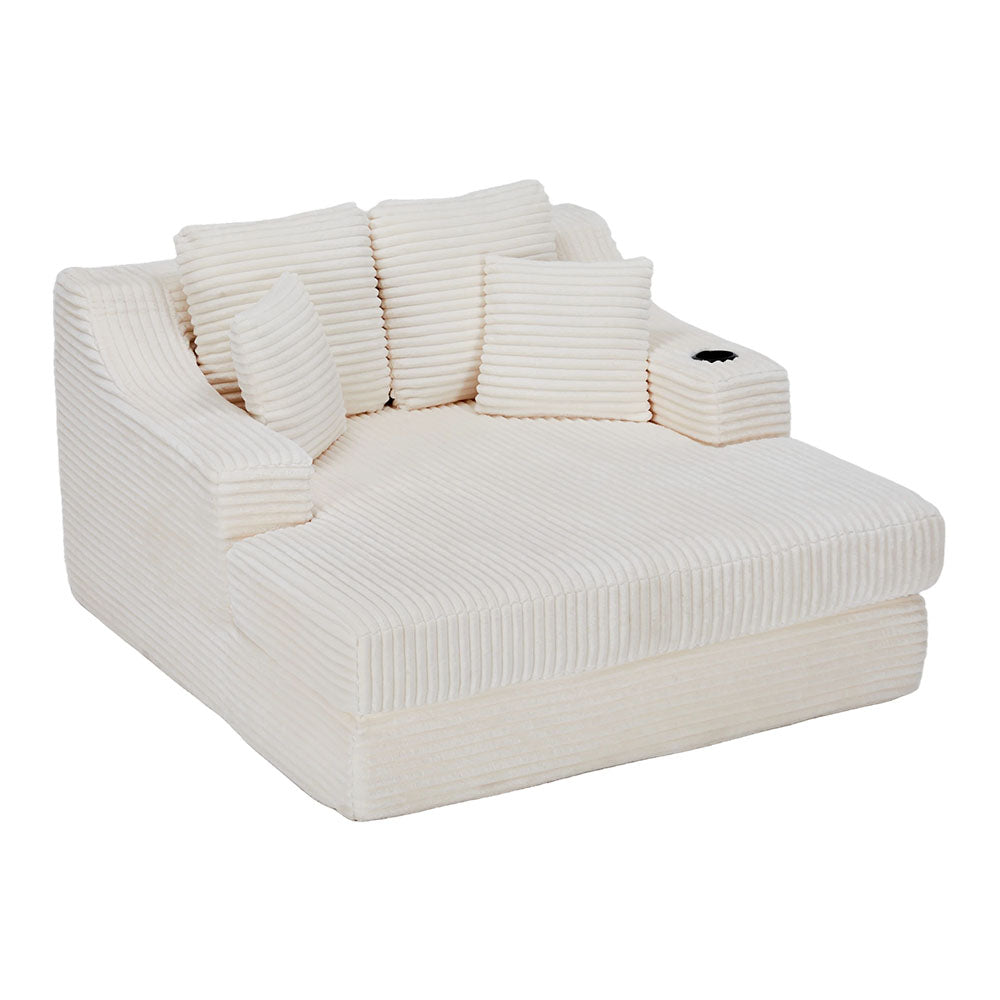 Discover a soothing retreat right at home with this chaise lounge sofa bed. Its clean, streamlined design complements any interior, while the soft corduroy upholstery with subtle vertical ribbing adds inviting texture. A built-in cup holder on the left armrest keeps your drink securely in place during reading, binge-watching, or peaceful moments of rest. Two matching throw pillows add extra comfort and a refined finishing touch. Whether you are enjoying a lazy Sunday afternoon or immersed in an intense gaming session, it offers a personal oasis where you can relax and unwind with ease.