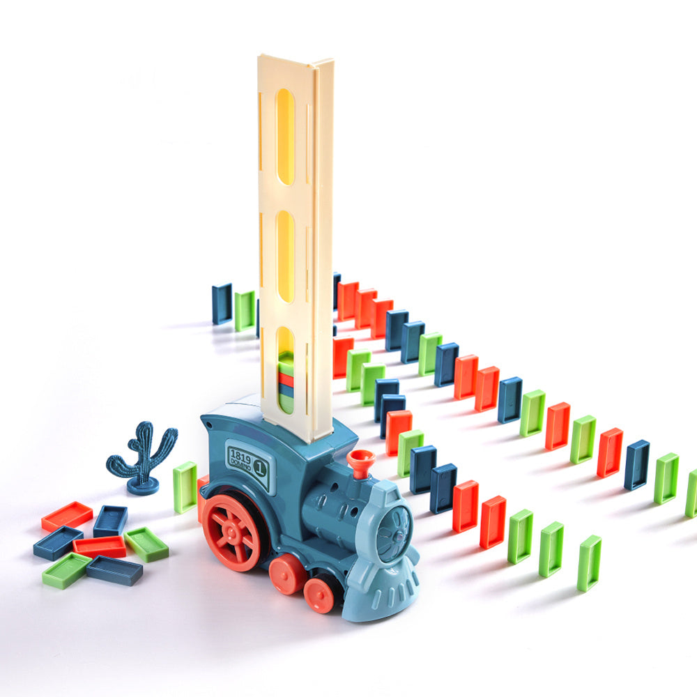 Embark on a journey of limitless creativity with this dominoes electric train playset. The electric train can automatically lay the dominoes route, just put the plastic building blocks in the cartridge, and insert them into the train top. When the switch is activated, the train moves across the floor or table, automatically releasing a row of dominoes as it goes. Just push one of the dominoes to watch the chain reaction and help exercise your child's cognitive skills. Kids can also rotate the train chimney to change the direction of travel.