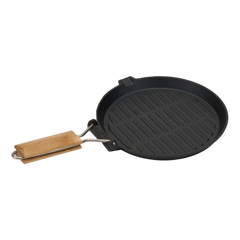 This classic cast-iron grill pan is durable, healthy, and built to last. Even heat distribution makes it perfect for eggs, steaks, roasted vegetables, and more. The grill ridges effortlessly create attractive sear marks, adding authentic barbecue flavour and enhancing both aroma and presentation. With regular use, the surface develops a natural non-stick seasoning for easier cooking and cleaning. The wooden handle with metal reinforcement offers a secure, heat-resistant grip. Compatible with gas, induction, and ceramic hobs, ovens, and grills, making it ideal for seamless transitions from hob to oven.