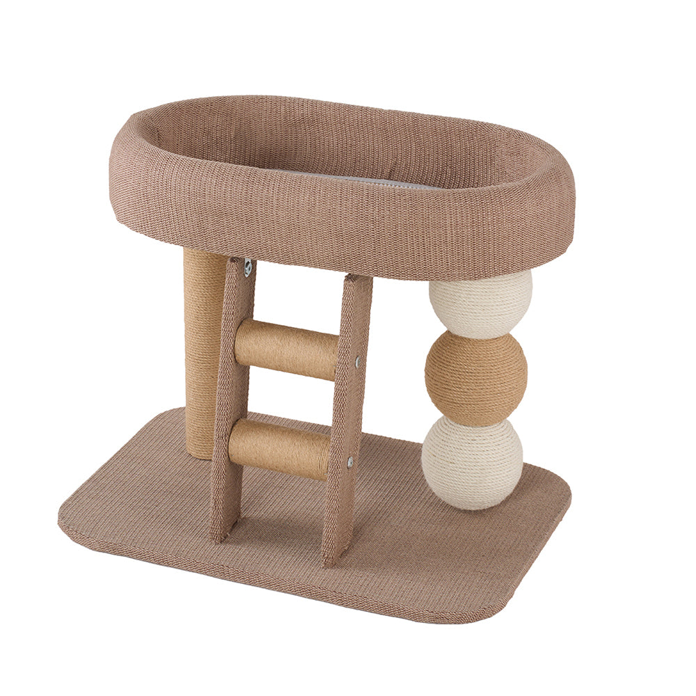 This cat tree combines play, scratching, and resting in one practical and thoughtful design. Finished in soft natural wood and beige tones, it blends seamlessly into modern homes with a warm, minimalist look. The top features a spacious soft cat perch lined with a comfortable jute pad for cosy naps. Its two-tier layout allows cats to jump freely between levels, encouraging active play. A sturdy post and a spherical column are tightly wrapped in durable jute rope, perfect for natural scratching behaviour. Additionally, a wide, stable climbing ramp ensures easy access while adding fun and exercise for your cats.