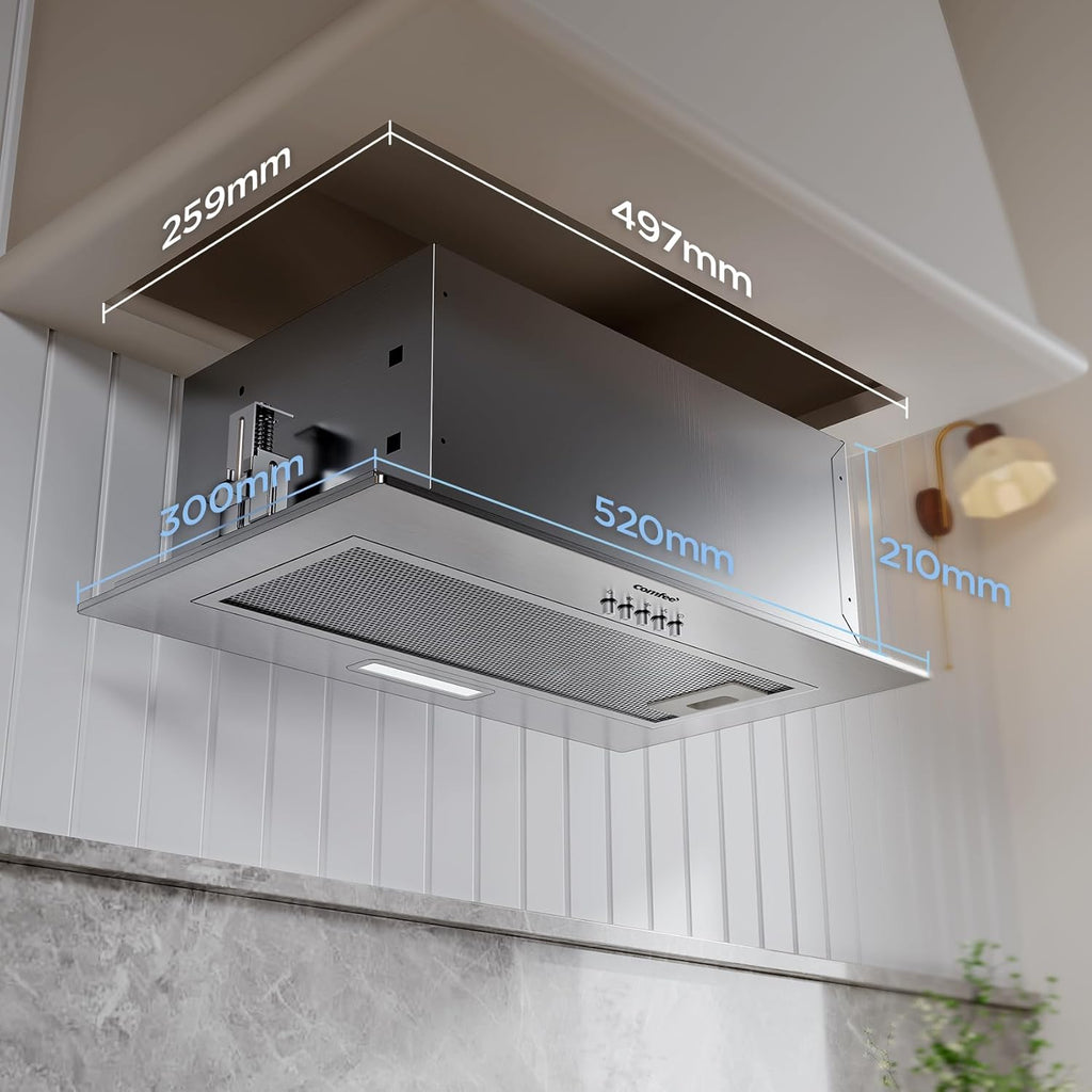 Keep your kitchen smelling fresh with our high-performance 52cm integrated cooker hood! Featuring a powerful motor, it boasts an impressive 400m³/h extraction rate, swiftly banishing grease, odours, and steam. Three adjustable speed settings cater to all your cooking styles, from gentle stewing to lively stir-frying. For ultimate convenience, its dual suction options allow for external venting by ducting or internal recirculation with a carbon filter. Its sleek, modern design seamlessly integrates into any kitchen aesthetic, offering both powerful performance and understated elegance. Enjoy a cleaner, fresher cooking environment with this essential appliance.