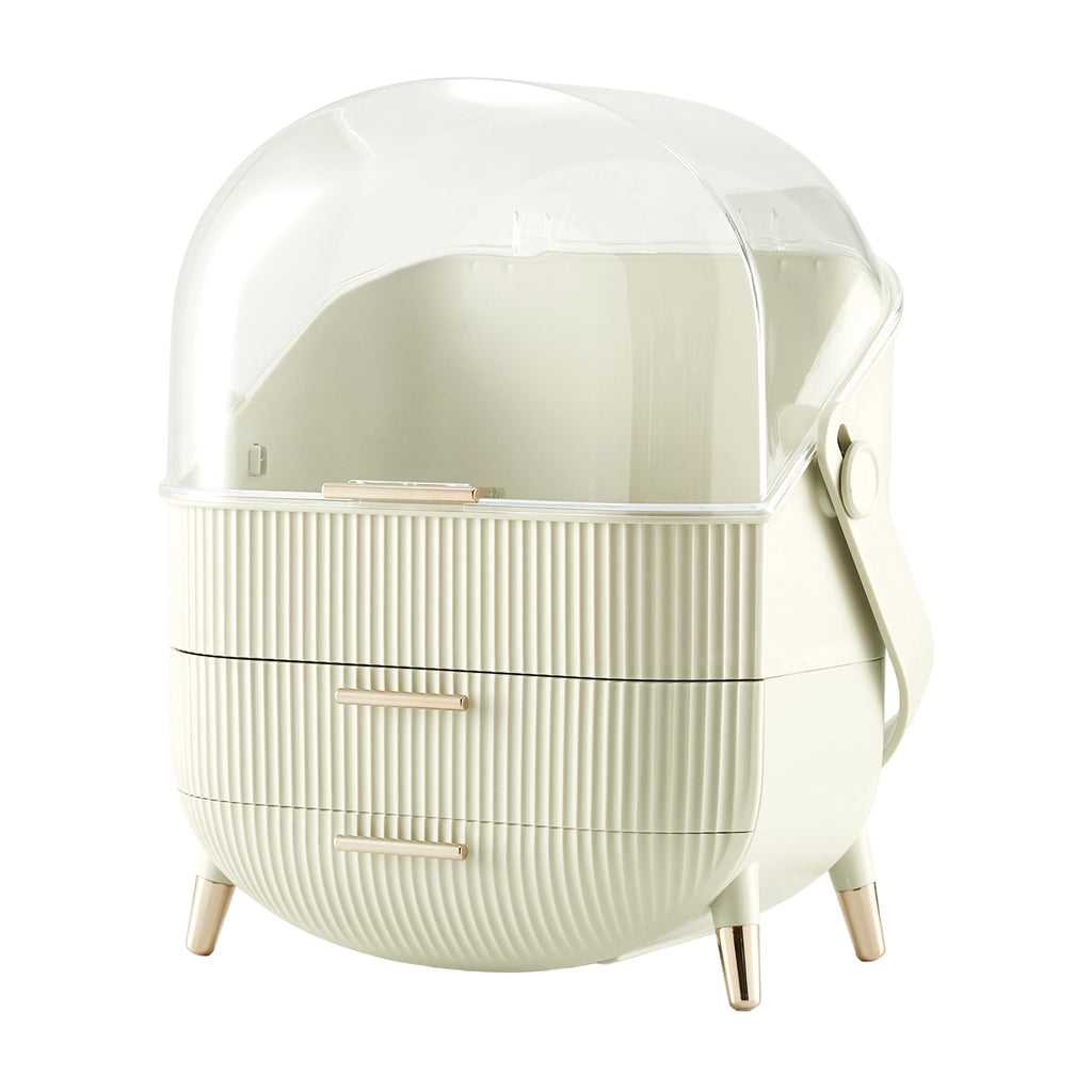 This makeup storage box, adorned with sparkling rhinestones on the surface, seamlessly blends functionality with aesthetic appeal. The top compartment offers ample storage space for items like moisturizers, creams, foundations, and perfumes, helping keep your desktop tidy. Two separate drawers at the bottom provide additional organized storage, ideal for categorizing lipsticks, eyebrow pencils, makeup brushes, and more. The transparent top cover not only allows clear visibility of the contents but also effectively protects against dust. Additionally, each layer is equipped with delicate handles for effortless access.