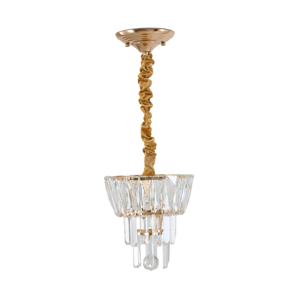 This ceiling light brings a touch of luxury to any interior space with its exquisite craftsmanship and elegant design. The light body features a golden base paired with an artfully pleated suspension cord, exuding both nobility and artistic flair. The crystal lampshade, meticulously cut and arranged, refracts light into dazzling shadows when illuminated, adding boundless charm to the room. Its compact yet multi-layered design seamlessly complements various home styles, making it an ideal choice for elevating your home’s aesthetic appeal.