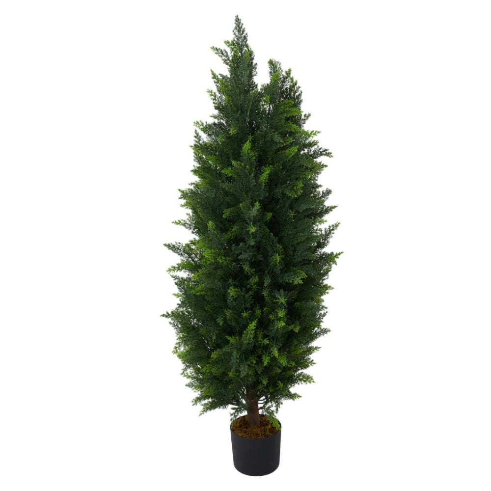 This artificial cypress tree adds a touch of tropical charm to your living space. Featuring a highly realistic trunk with detailed texture and vibrant green leaves, it presents a lush, multi-layered, and lifelike appearance. The sturdy black planter provides a solid base, while the addition of artificial moss enhances the authentic aesthetic. Perfect for patios, balconies, or living rooms, it serves as a beautiful focal point in any setting. Requiring no watering or sunlight, this evergreen plant maintains its beauty year-round, allowing you to enjoy lasting natural elegance effortlessly.