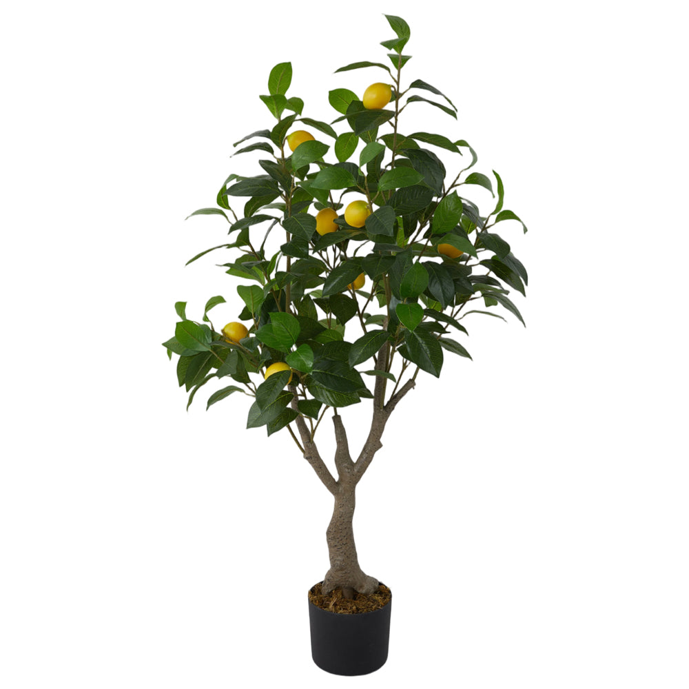 This stunning artificial lemon tree effortlessly adds a touch of Mediterranean charm to your home or office. Crafted with realistic green leaves and vibrant yellow lemons, it brings a fresh and natural atmosphere to any space. The sturdy black planter provides a solid base, while the addition of artificial moss enhances the authentic aesthetic. Whether placed in the living room, entrance, or patio, it serves as a beautiful decorative accent. With no need for watering or sunlight, its low-maintenance design makes it ideal for year-round decoration.