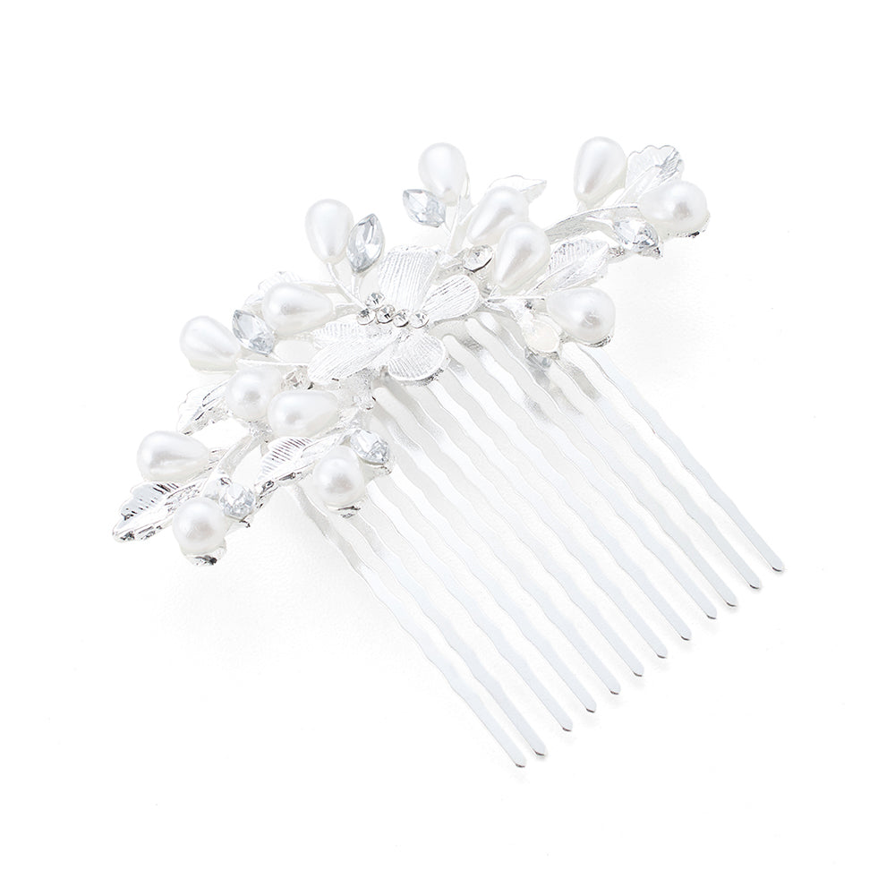 Add a touch of elegance to your hairstyle with this vintage-inspired hair accessory. Crafted with a layered floral design, the comb features delicate petals in combination with faux pearls and matching leaves. Sparkling rhinestones enhance its charm, making it perfect for any occasion. Whether worn with an updo, a low bun, or paired with a veil, this accessory stays securely in place and effortlessly elevates your look. It is ideal for brides, bridesmaids, or simply as a sophisticated addition to your daily style.
