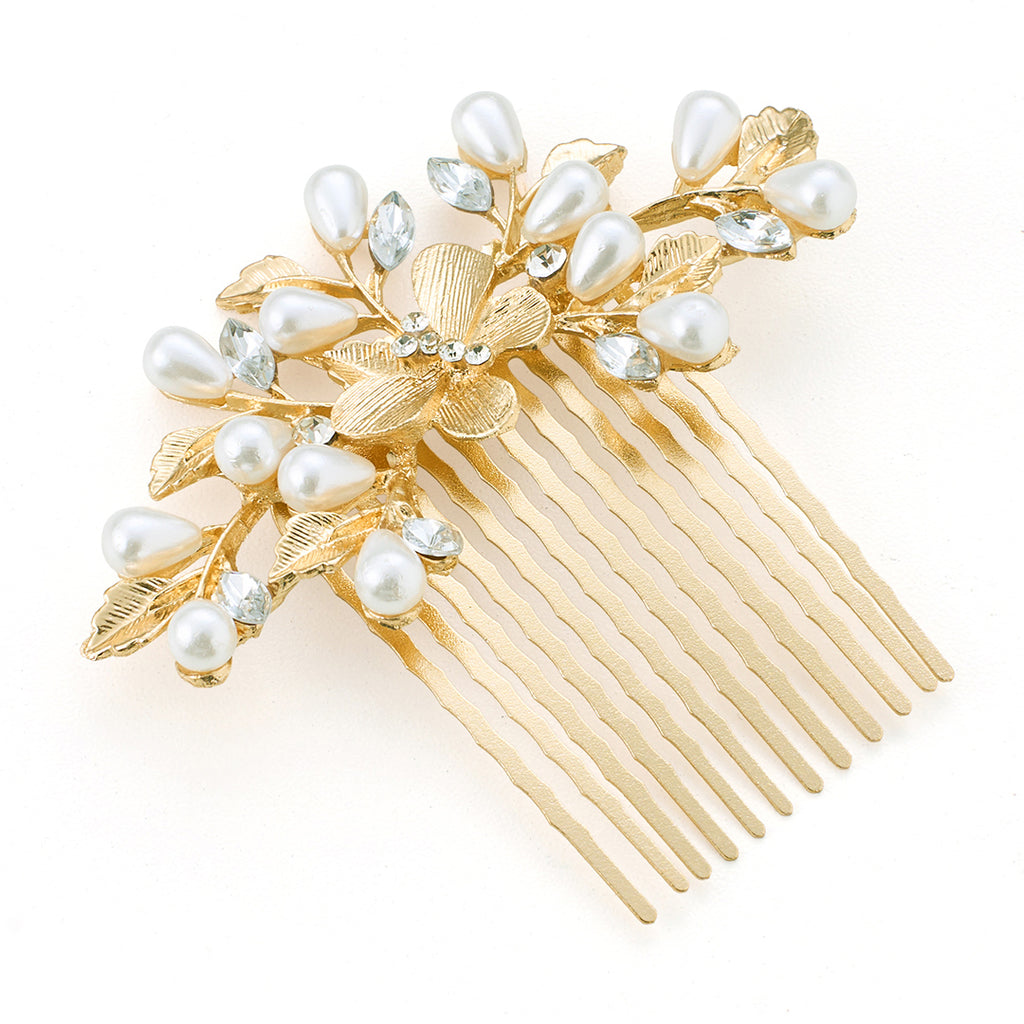 Add a touch of elegance to your hairstyle with this vintage-inspired hair accessory. Crafted with a layered floral design, the comb features delicate petals in combination with faux pearls and matching leaves. Sparkling rhinestones enhance its charm, making it perfect for any occasion. Whether worn with an updo, a low bun, or paired with a veil, this accessory stays securely in place and effortlessly elevates your look. It is ideal for brides, bridesmaids, or simply as a sophisticated addition to your daily style.