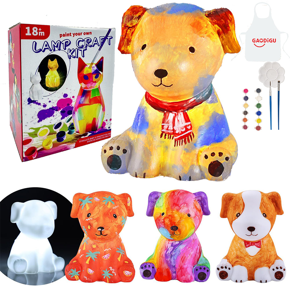 Unleash the inner artist of your child with this fantastic DIY dog lamp painting kit! This comprehensive set includes a dog lamp, 12 vibrant paints, an apron, two brushes, and a palette, providing everything needed for a complete creative experience. Your child can freely express their imagination, painting a one-of-a-kind masterpiece and developing artistic interest, creativity, and fine motor skills. The real magic happens with the built-in LED light, transforming their colourful creation into a charming night light. It is a brilliant way to combine fun and education, teaching colour mixing and painting techniques while fostering parent-child bonding. Perfect for encouraging creativity and spending quality time together.