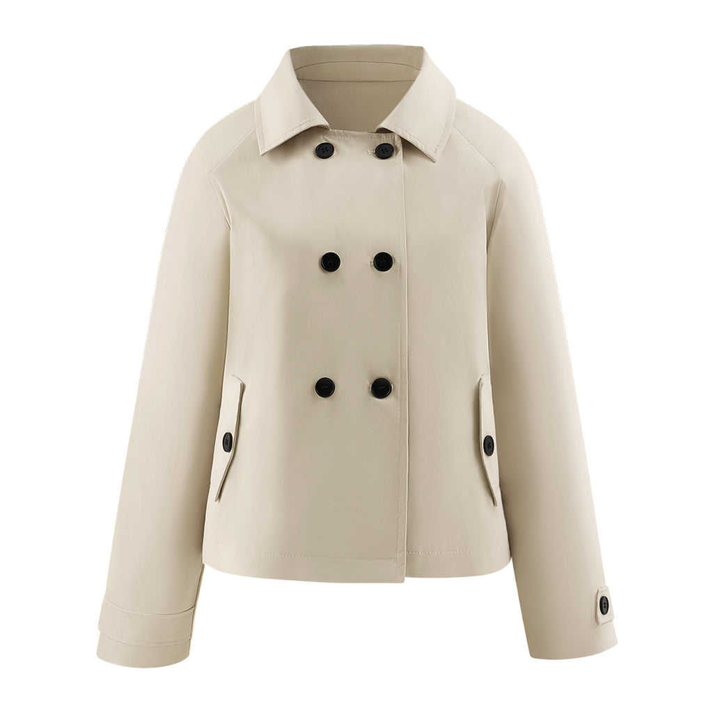 Embrace effortless elegance with this khaki short trench coat. The classic lapel and double-breasted design create sharp, flattering lines, exuding timeless sophistication. Button details at the cuffs enhance the overall refined look, while the versatile colour complements a variety of outfits, from jeans to dresses or trousers. This coat offers both style and functionality, making it a must-have addition to any wardrobe, perfect for both casual and formal occasions.