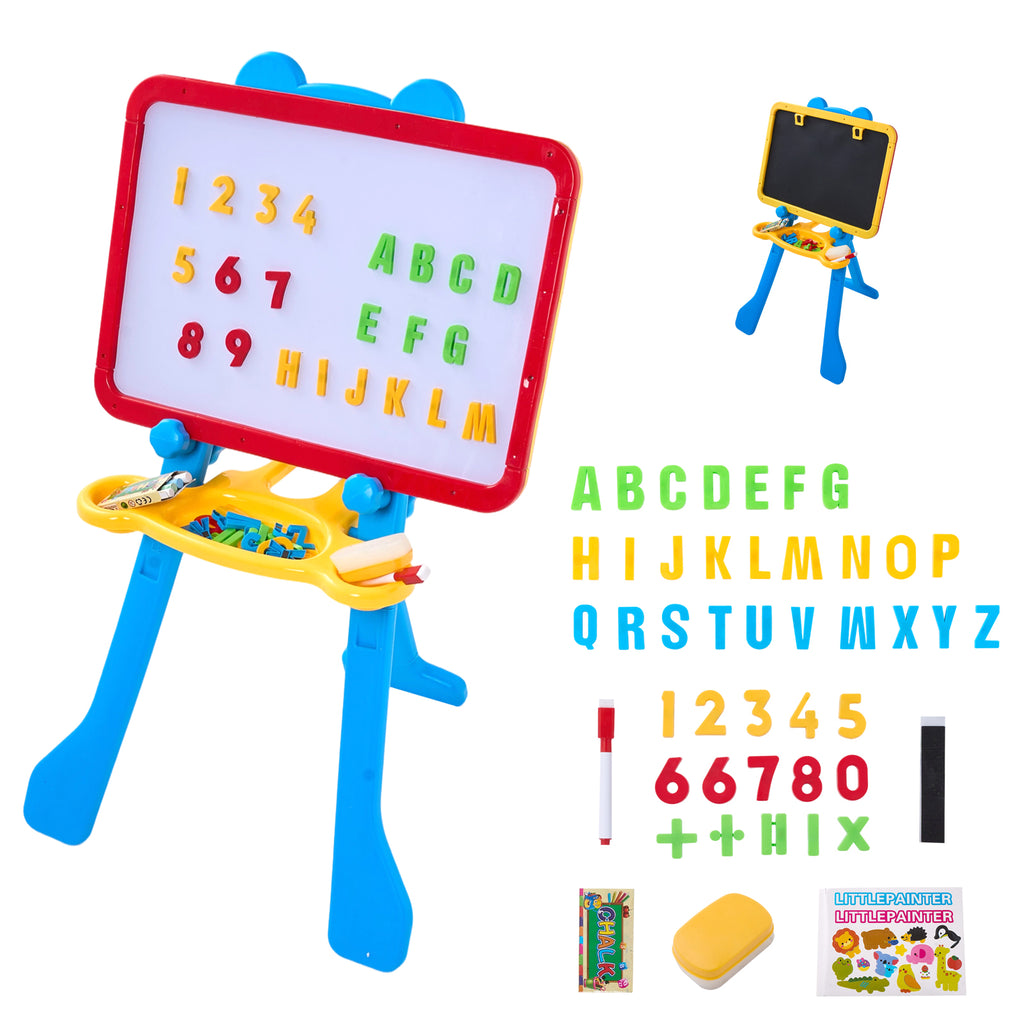 Create a safe and versatile creative station for your child with this art easel. It is crafted from durable plastic with smooth, rounded edges for worry-free use. A stable tripod base ensures steady support, while the double-sided board offers a magnetic whiteboard for early learning and a chalkboard for free drawing. Complete with letters, numbers, pens, chalk, and a duster, it delivers a ready-to-use experience that supports creativity, basic literacy, and numeracy through engaging play.