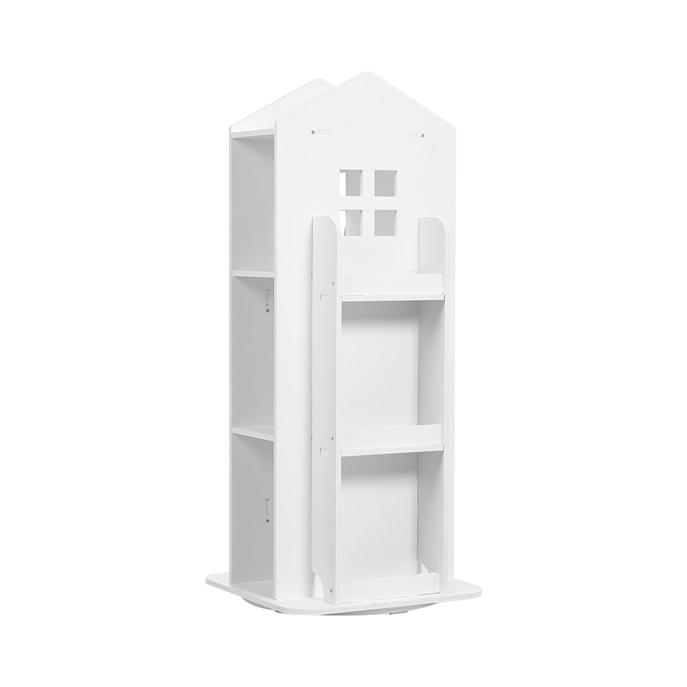 Dieses Kinderbuchregal ist in der Form eines kleinen Hauses gestaltet und wirkt besonders kreativ. Mit den Maßen 41 x 41 x 95 cm bietet das Regal eine ideale Höhe für Kinder. Dieses „Haus“ verfügt über Regalböden an allen vier Seiten: Zwei Seiten bestehen aus drei Regalebenen, während die mittlere Seite vier Ebenen hat. Sie bieten reichlich Platz für Kinderartikel wie Bücher und Spielzeug. Gleichzeitig können darin Alltagsgegenstände präsentiert werden. Der Sockel des Bücherregals verfügt über eine Drehscheibe mit rutschfesten Polstern, sodass es stabil steht und sich leicht drehen lässt, um Bücher bequem zu entnehmen. Es besteht aus robusten WPC-Platten mit abgerundeten Ecken. Jede Platte lässt sich durch Zapfenverbindung befestigen und mit Schrauben verstärken.