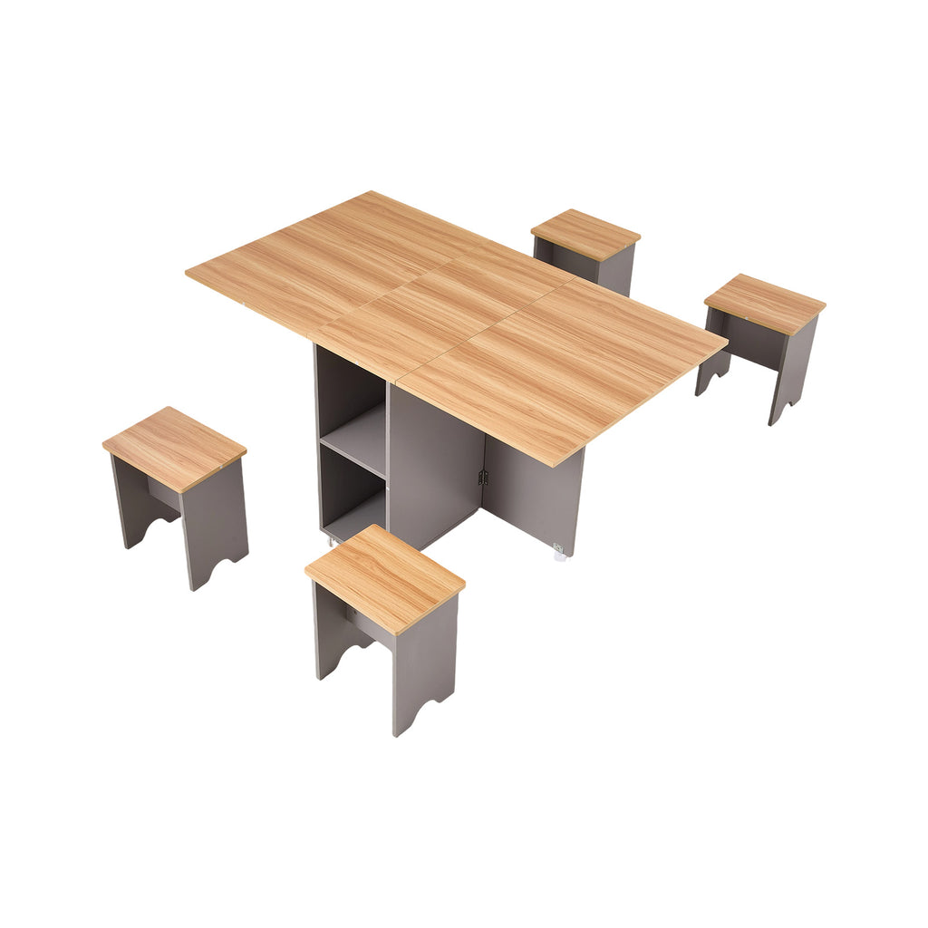This modern and minimalist dining table set combines practicality with stylish design. The spacious tabletop offers ample room for you to comfortably gather with family or friends and enjoy delicious meals. The set includes four matching stools for added convenience. Open two-tier storage shelves beneath the table provide a clever space for tableware and other essentials, helping to keep the kitchen tidy and organized. With its adjustable design, the table can be fully expanded as a dining table, half-folded as a writing desk, or fully folded as a sideboard. Crafted from high-quality particle board, this set ensures lasting durability and is the perfect companion for your cherished moments at home.