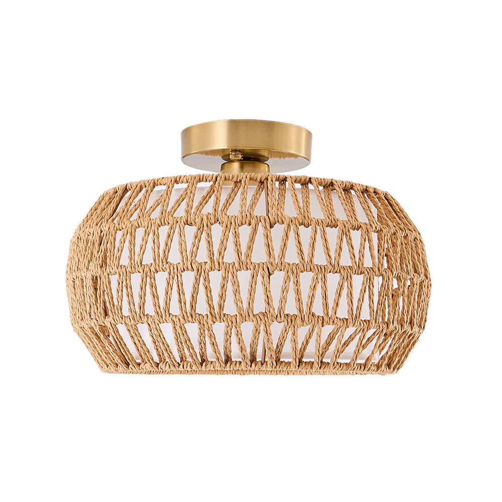 Bring airy warmth to your space! This ceiling light features a double-layer shade design, with an outer hand-woven hemp rope shade showcasing interwoven geometric textures that create rhythmic, fluid lines. An inner soft fabric diffuser creates layered lighting to enhance gentle illumination. Its drum-shaped silhouette feels full yet visually lightweight, resembling a ceiling-hung artwork, ideal for living rooms, bedrooms and hallways.