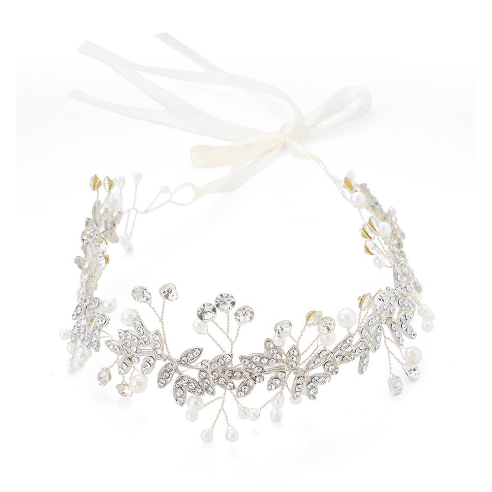 Exude elegance with every detail in every look. This wedding headband features a delicate three-petal leaf design that captures a blend of vintage charm and modern sophistication. Adorned with shimmering rhinestones and soft faux pearls, it adds a touch of glamour and romance to your hairstyle. The intricate arrangement of leaves and pearls reflects a fine sense of craftsmanship, casting a subtle yet dazzling glow. Perfect for any elegant occasion, this headband effortlessly enhances your bridal hairstyle, whether worn alone for a chic updo or paired with a veil for the ultimate wedding day ensemble.